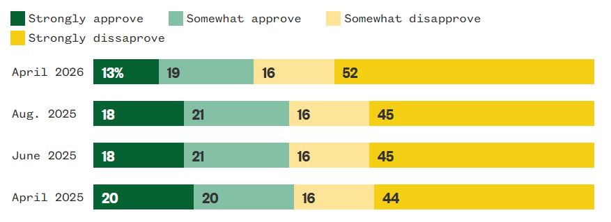 Осталось это прокомментировать: В апреле 2025 года "за Трампа" выступало 45% американцев (26% "сильно" и 19% "слегка"), "против Трампа" выступали 55% американцев (13% "умеренно" и 42% "сильно"). В конце октября – начале декабря 2025 года "за Трампа" выступало 42% американцев (21% "сильно" и 21% "слегка"), "против Трампа" выступали 58% американцев (14% "умеренно" и 44% "сильно"). В конце января – начале февраля 2026 года ситуация сильно изменилась, против апреля 2025 года: "за Трампа" было только 39% американцев (22% "сильно" и 17% "слегка"), "против Трампа" было 61% американцев (13% "умеренно" и 50% сильно). Наконец, в первой половине апреля 2026 года "за Трампа" было 37% американцев (20% "сильно" и 17% "слегка"), "против Трампа" было 63% американцев (13% "умеренно" и 50% "сильно").