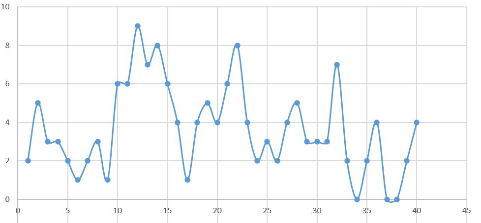 Обратимся к статистическим данным. На рис. 1 показано распределение вооруженных конфликтов в зависимости от их продолжительности по данным, приведенным в Википедии. На горизонтальной оси отложена продолжительность конфликтов в годах. Конфликты с продолжительности меньше года и больше 40 лет не рассматривались, также как неоконченные конфликты. На вертикальной оси отложено количество конфликтов с данной продолжительностью.