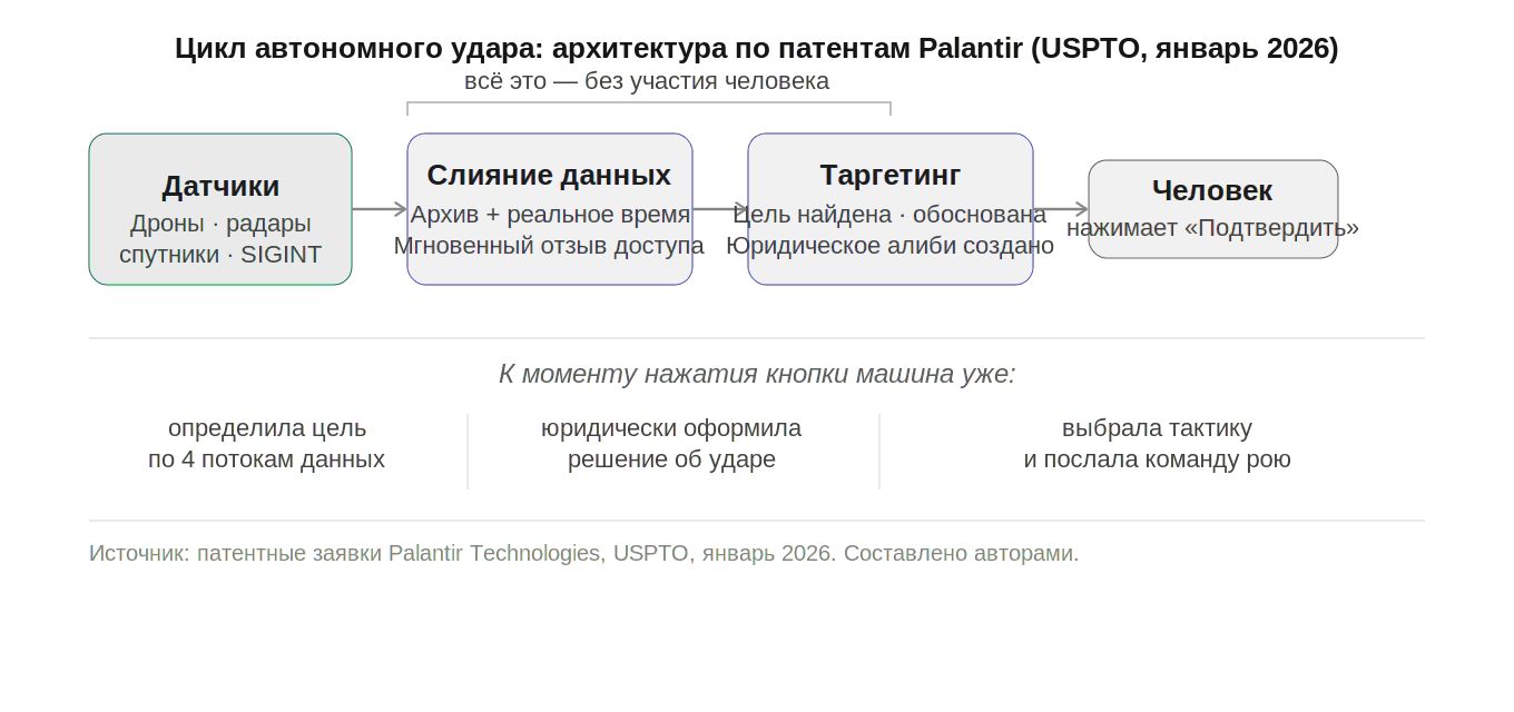 На смену Lockheed Martin и Raytheon пришёл альянс "неопраймов" – компаний, для которых софт является не надстройкой, а смыслом железа. Palantir формирует "динамическую онтологию" – живую карту реальности, обновляемую быстрее, чем человек способен её прочитать. Патенты описывают механизм "юридического алиби": каждое решение машины об ударе намертво привязано к датчику, правилу и прецеденту. Машина сама обосновывает правомерность насилия. Вот документированная архитектура этого процесса на основе патентных заявок, поданных в USPTO в январе 2026 года.